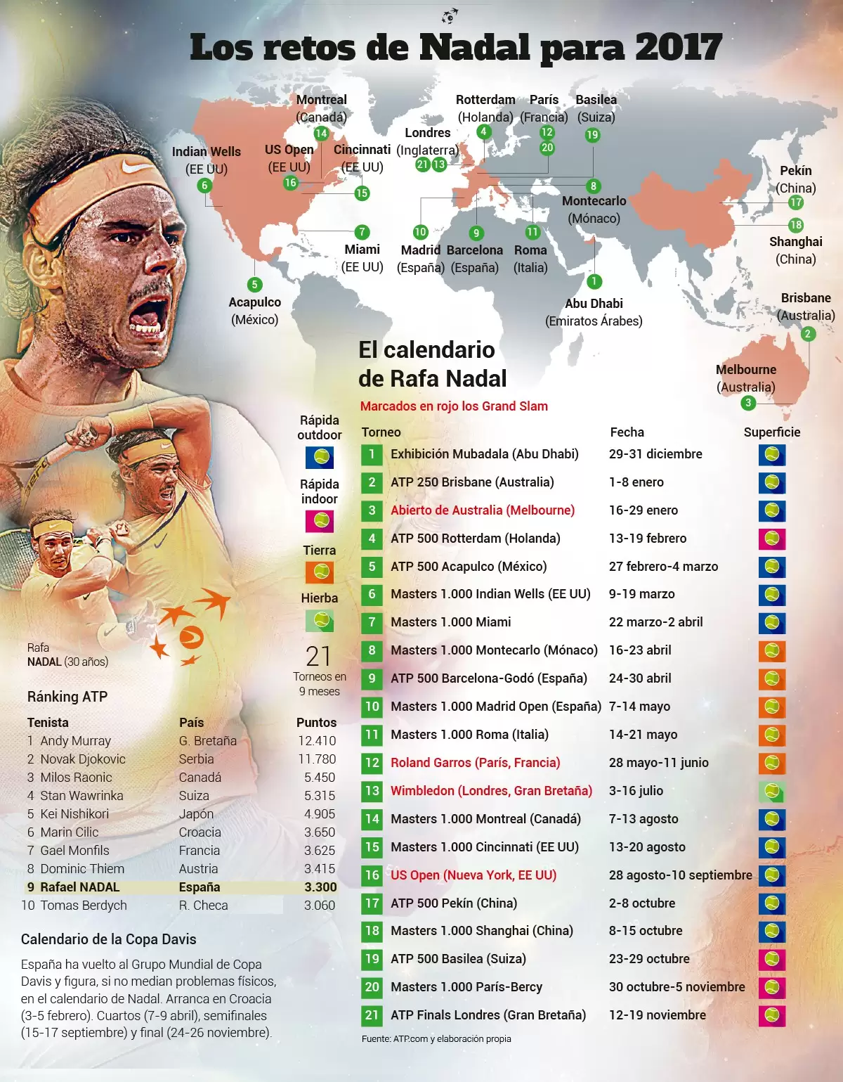 Desde el equipo de trabajo del tenista español Rafael Nadal, se dio a conocer el calendario oficial de competición para la próxima temporada con la novedad de que competirá sólo dos veces en el hemisferio sur del planeta.