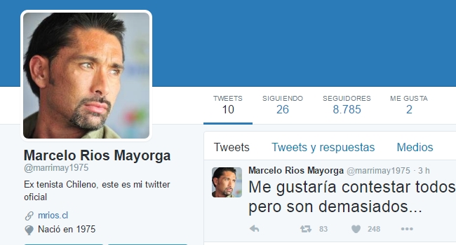 Marcelo Ríos, ex tenista chileno y número 1 de la ATP en 1998, se sumó a Twitter. Con su nuevo perfil @marrimay1975 muchos dudaron de su veracidad pero enseguida, y con un video, se encargó de confirmarlo.