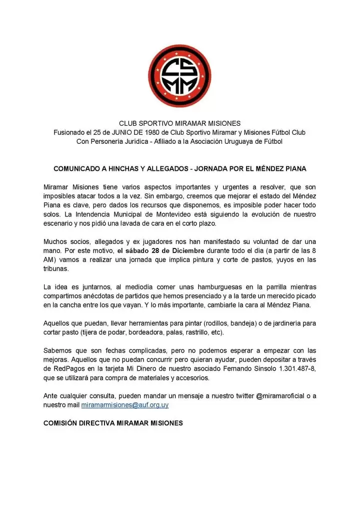 “Mejorar el estado del Méndez Piana es clave. Pero dados los recursos que disponemos, es imposible poder hacer todo solos (…) El sábado 28 vamos a realizar durante todo el día una jornada que implica pintura y corte de pastos y yuyos en las tribunas (…) La idea es juntarnos, comer unas hamburguesas mientras compartimos anécdotas y, a la tarde, un merecido picado en la cancha entre los que vayan (…) Lo importante es cambiarle la cara al estadio. Aquellos que puedan, llevar herramientas para pintar, rodillos, bandejas, o de jardinería para cortar el pasto (tijera de podar, bordeadora, palas, rastrillos...), dice el comunicado de la Comisión Directiva de Miramar Misiones”, dicta uno de los comunicados.
