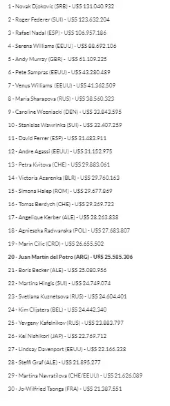 Volviendo a la lista, quien la encabeza es el serbio Novak Djokovic con ingresos totales de 131.040.932 dólares. También es líder del ranking y ganador de 74 títulos, 15 de ellos Grand Slam. En segundo lugar está Roger Federer (101 títulos, 20 Grand Slam), con 123.632.204 dólares y completa el podio Rafael Nadal (81 títulos, 17 GS), con 106.957.186 dólares.