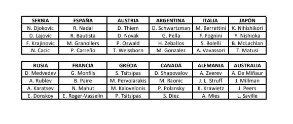 Los singlistas de Argentina son Diego Schwartzman (9°) y Guido Pella (44°), mientras que los doblistas son Maximiliano González (3°) y Horacio Zeballos (43°).
