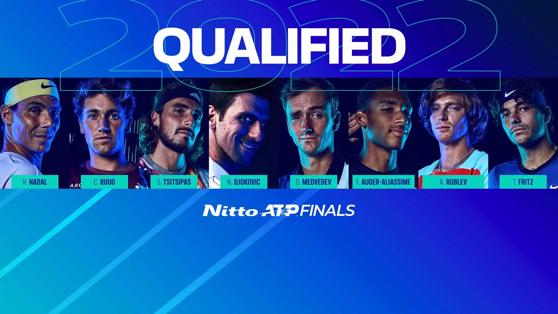 Los 8 jugadores que están clasificados para las Nitto ATP Finals de este año son: Rafael Nadal, Taylor Fritz (reemplazó a Alcaraz por lesión), Casper Ruud, Stefanos Tsitsipas, Novak Djokovic, Daniil Medvedev, Felix Auger-Aliassime y Andrei Rublev.